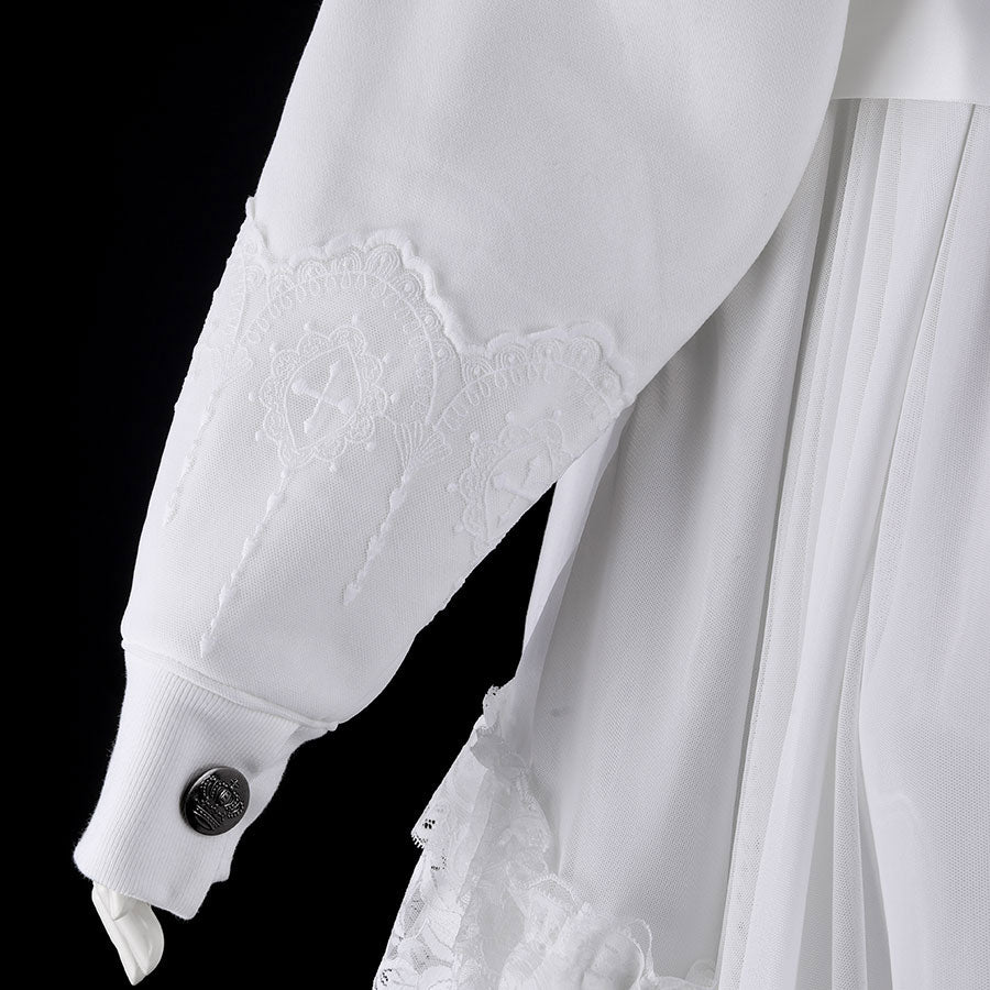 The sleeves have cross-patterned lace and the non-removable button has a crown for a gothic design.