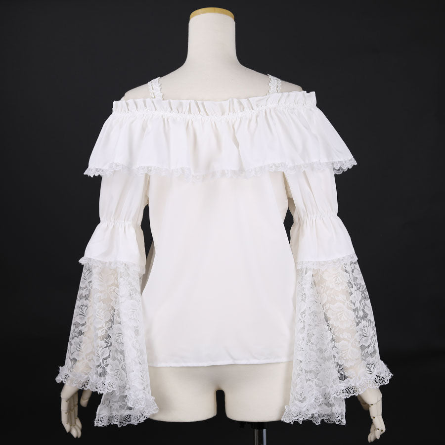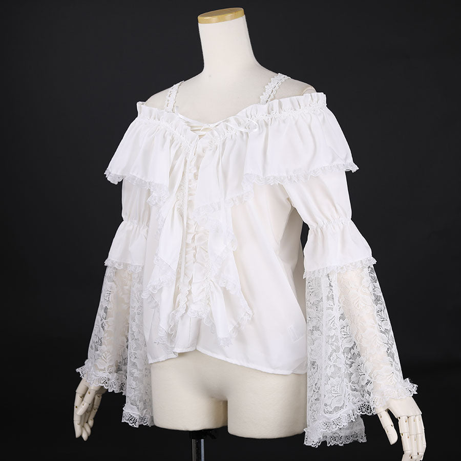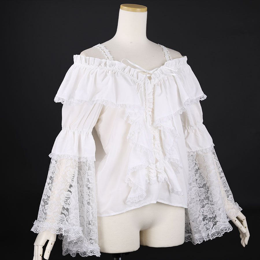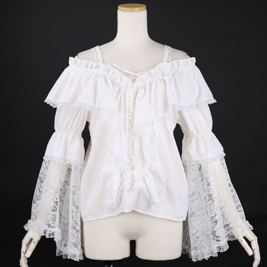 It is a blouse that uses plenty of frills and can be used off -shoulder and on -shoulder.