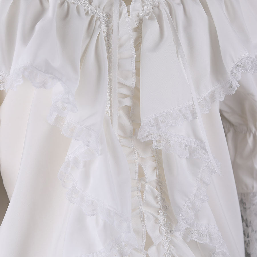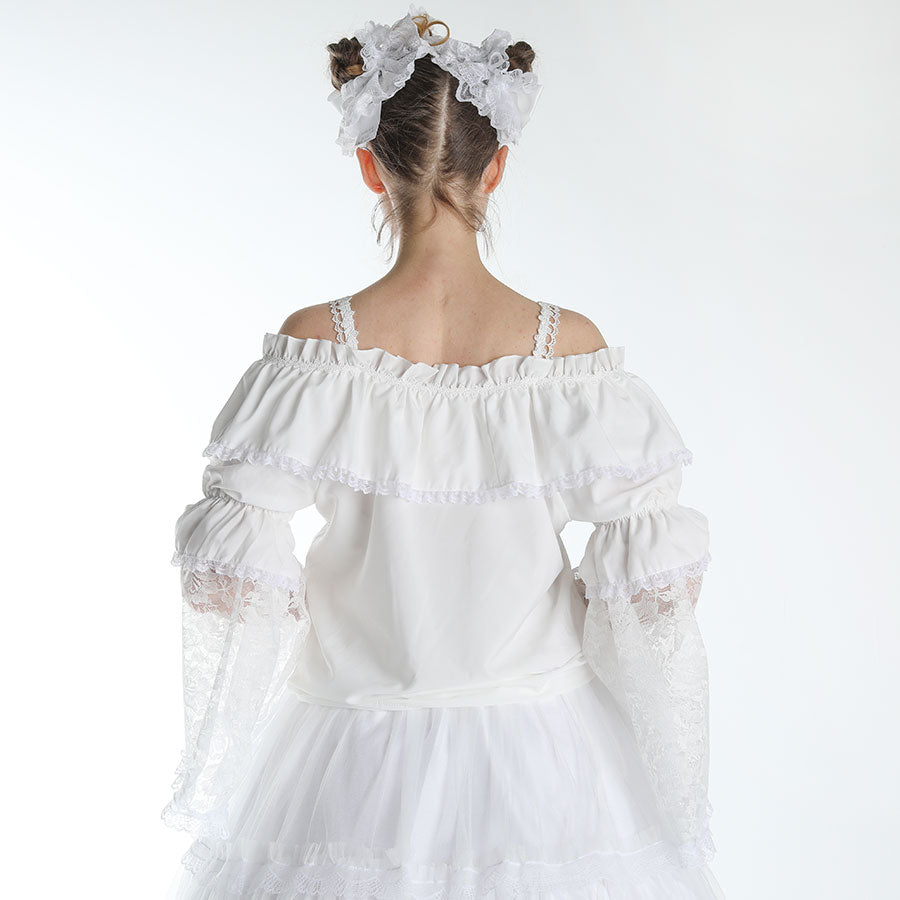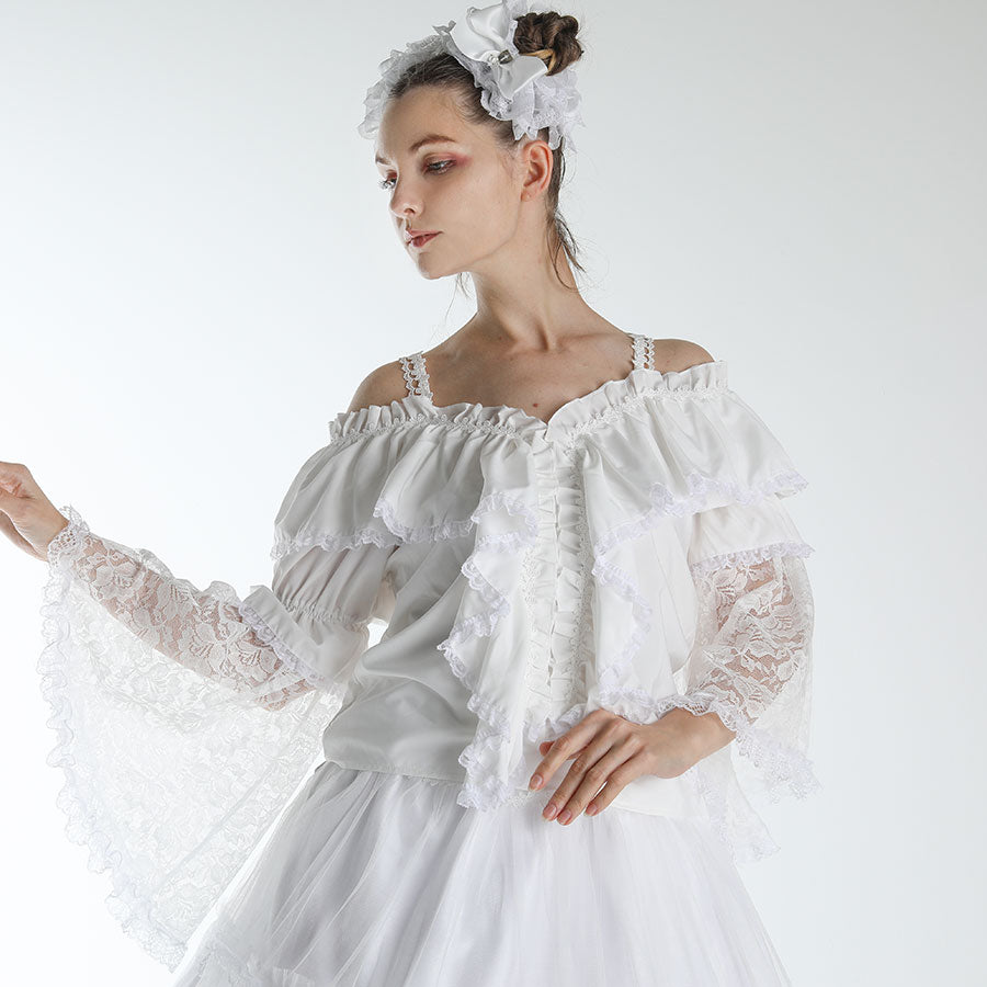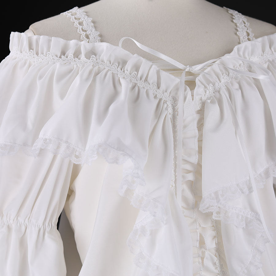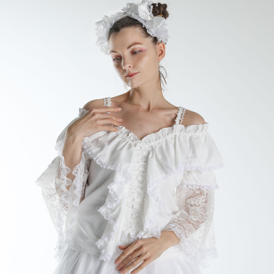 It is a blouse that uses plenty of frills and can be used off -shoulder and on -shoulder.