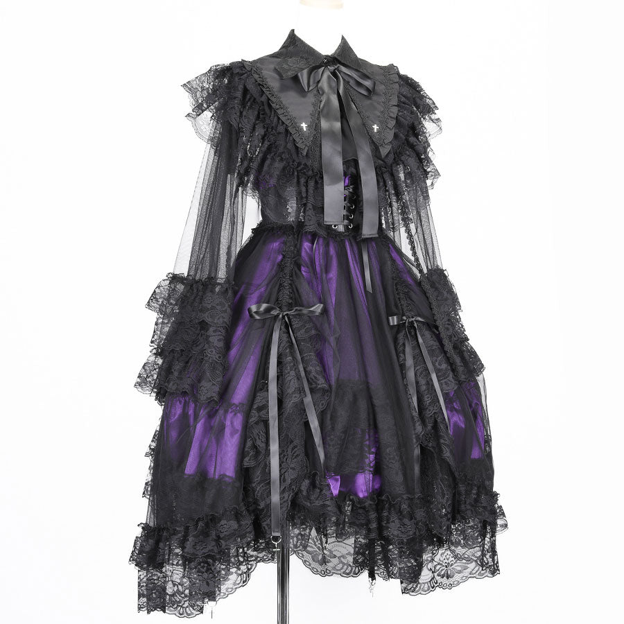 大きな襟とたっぷり使用したチュールレースが豪華なロングケープ。