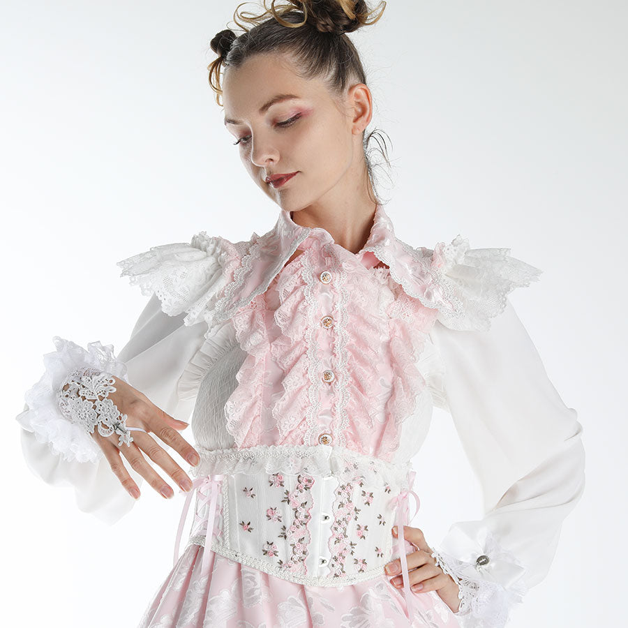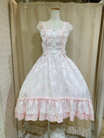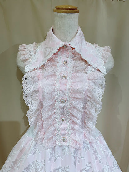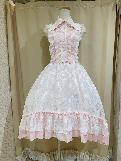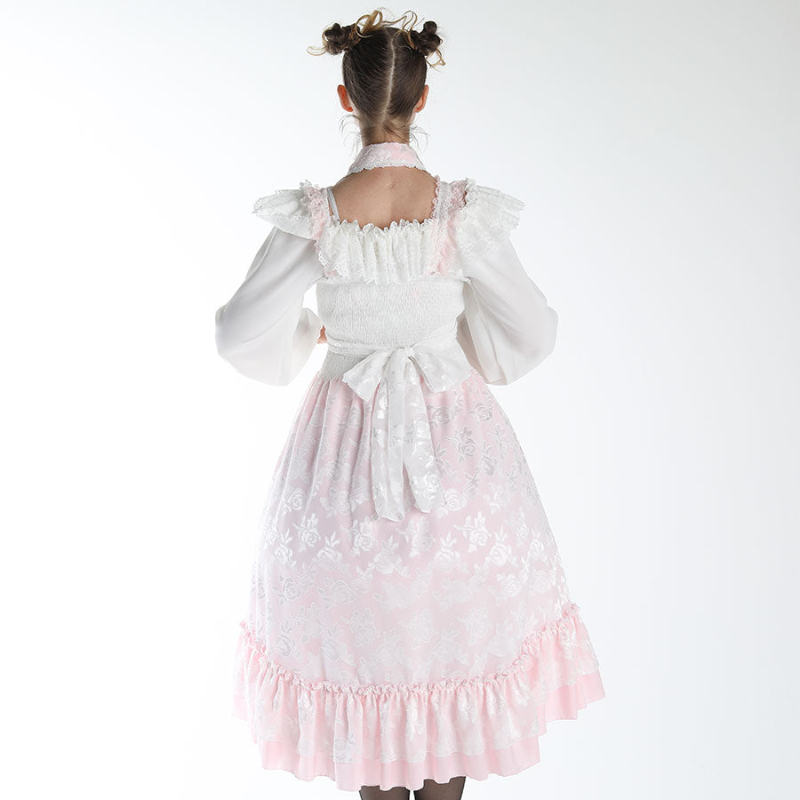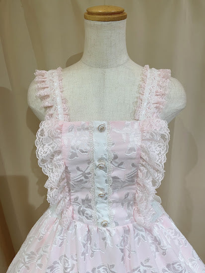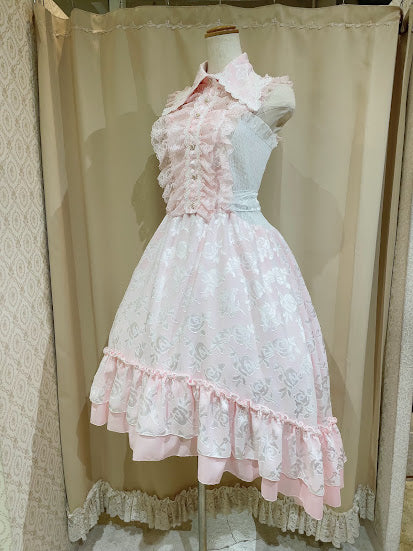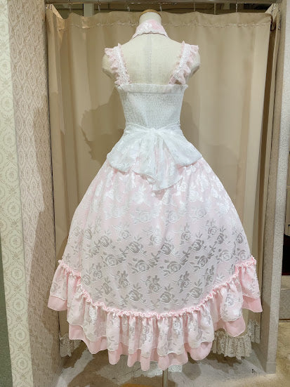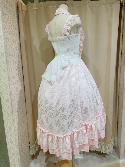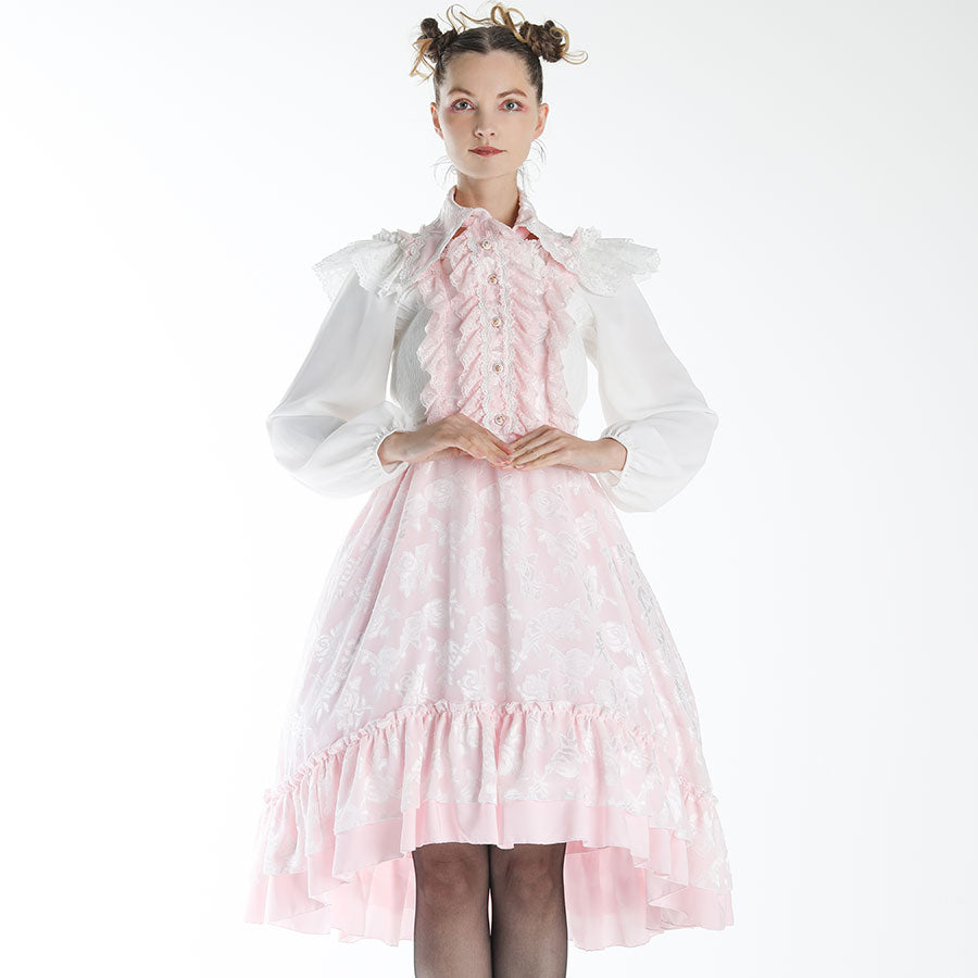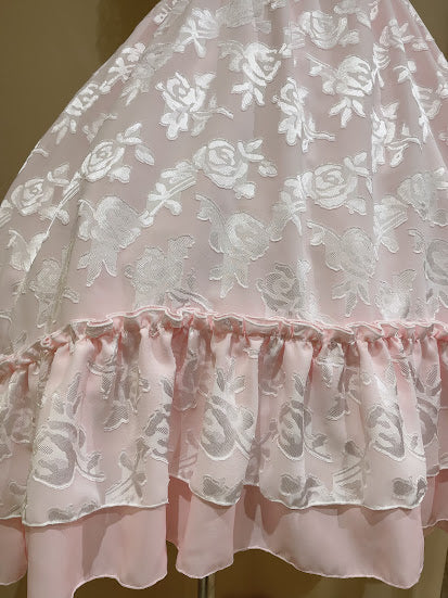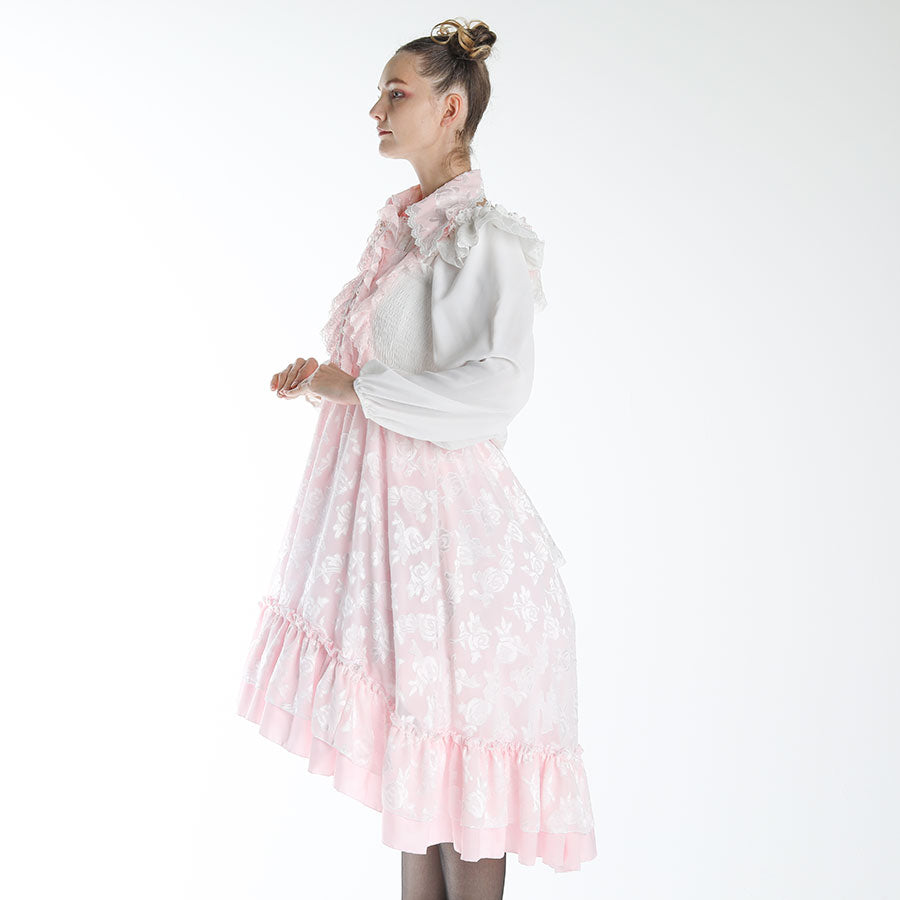 薔薇柄の透け感ある生地をメインにレースフリルデザインで豪華に仕上げたフィッシュテールワンピース。