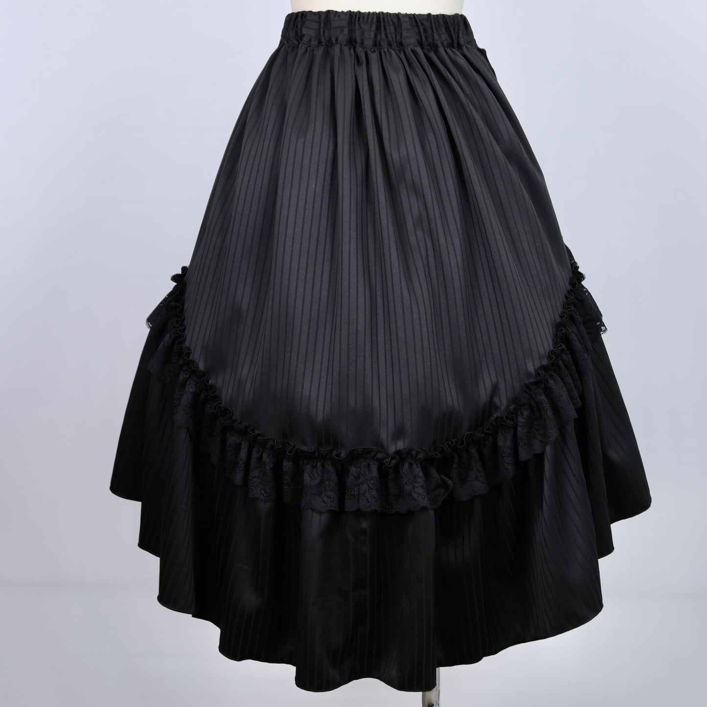 ストライプ柄の薄手の軽量な生地のフィッシュテールスカートに、フラワーケミカルレースがたっぷりあしらわれたエプロンのセット。