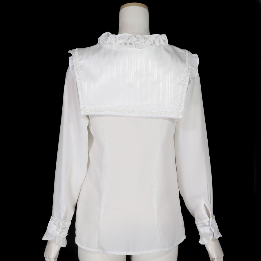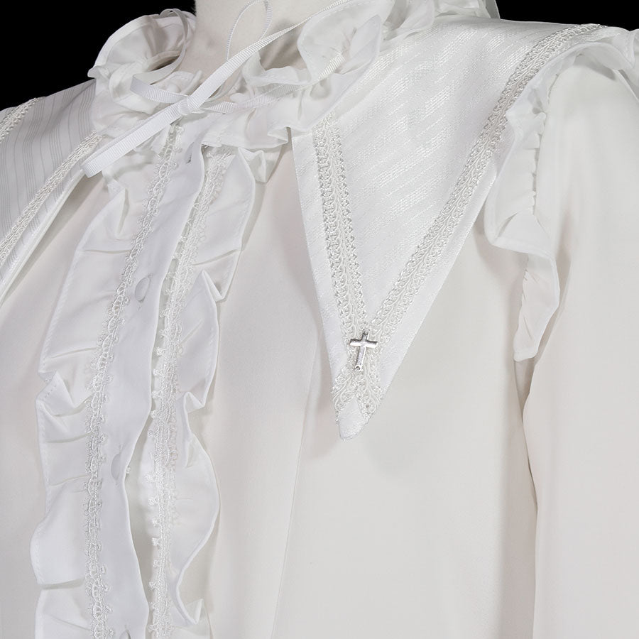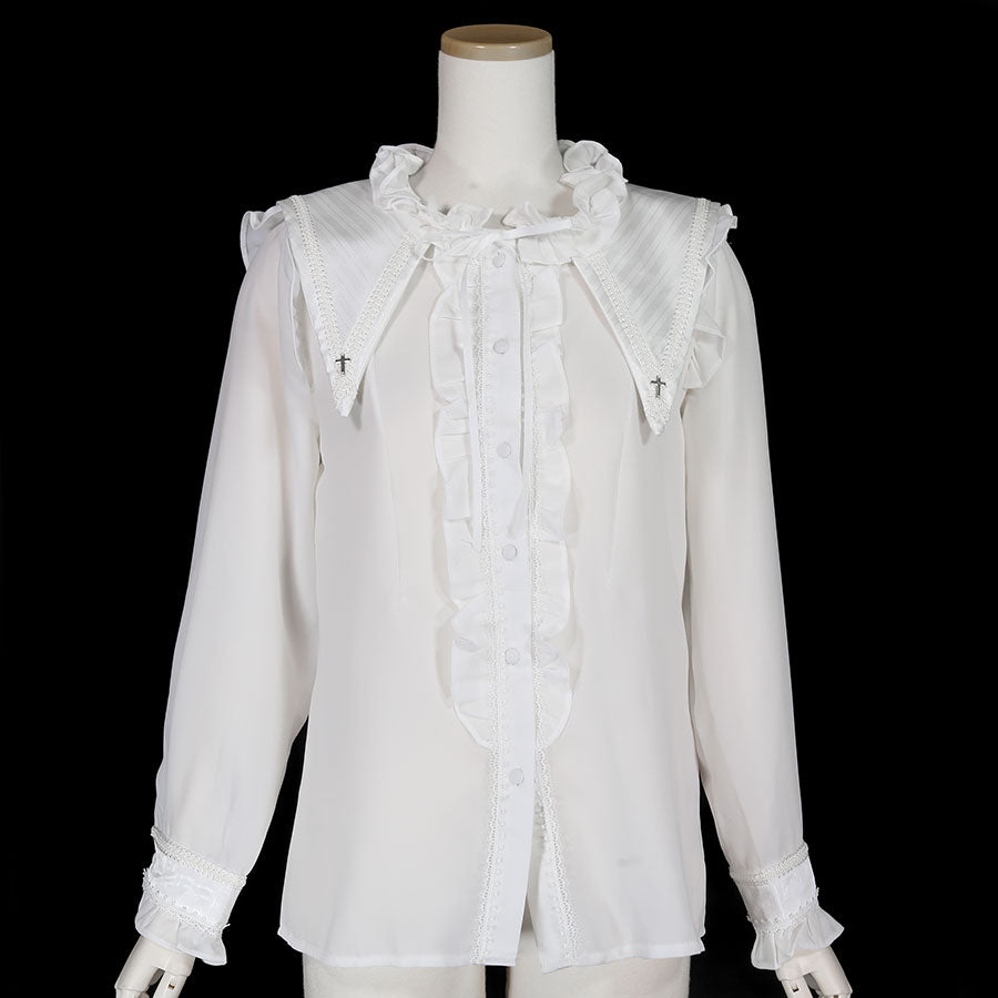 クロスチャームがついた、大きな衿が特徴のブラウス。