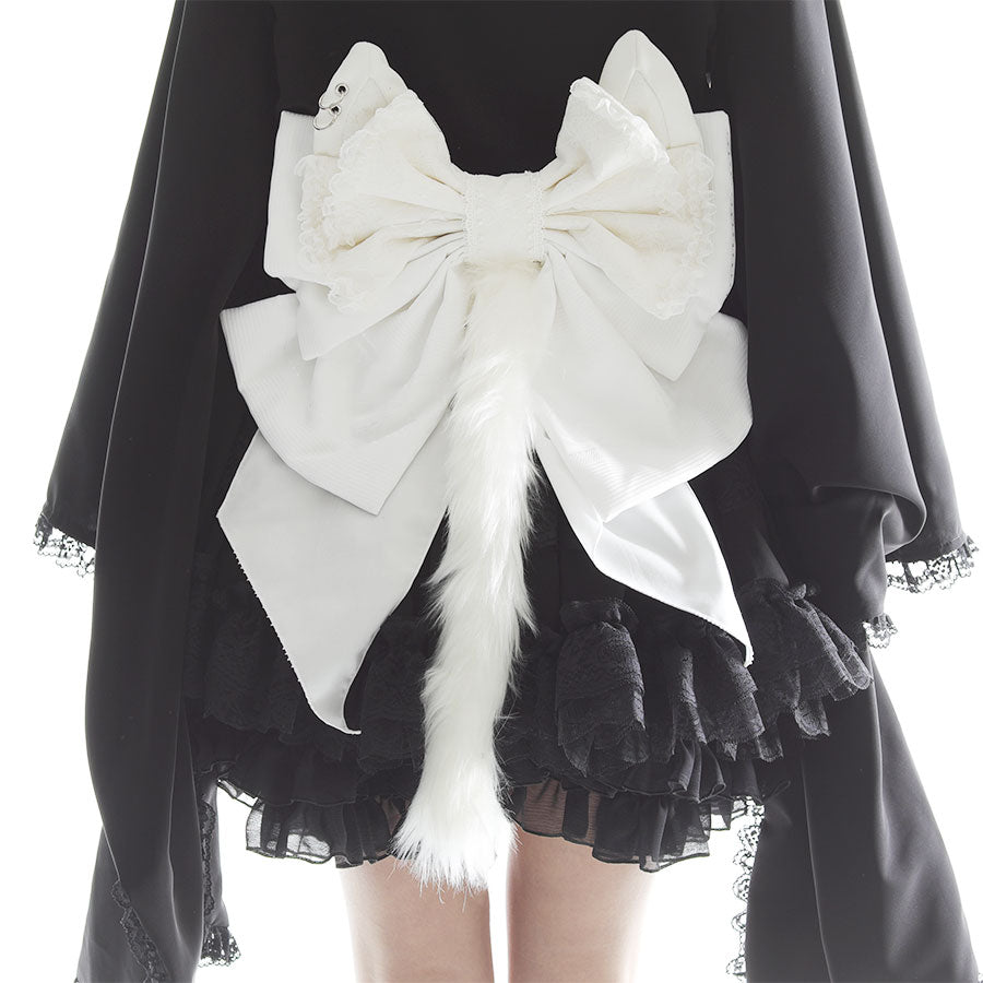背后配有一个大大的蕾丝蝴蝶结,蝴蝶结上还连接了一个柔软蓬松的猫尾巴。